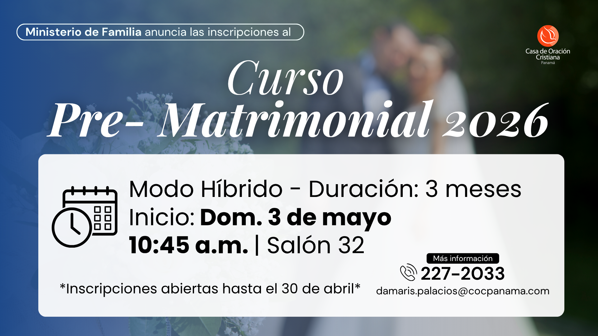 « Todos los Eventos Inicio Curso Pre-Matrimonial 2026 mayo 3 @ 10:45 am - 12:30 pm « Curso Pre-Matrimonial 2026 Añadir al calendario Google Calendar iCalendar Outlook 365 Outlook Live Detalles Fecha: mayo 3 Hora: 10:45 am - 12:30 pm Local Casa de Oración Cristiana Vía Santa Elena Panamá Panama Teléfono 227-2033